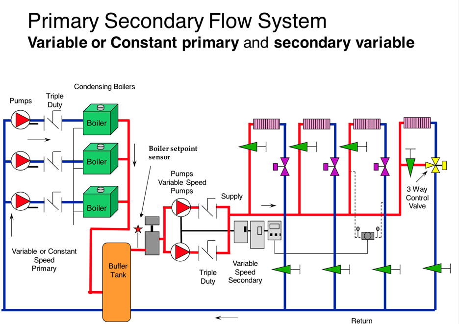 Good engineering practice continues to use this principle when the system uses a boiler buffer tank. Visit more at Hydronic Condensing Boiler Heating Buffer Tanks – Part 1 of 3 – Location.