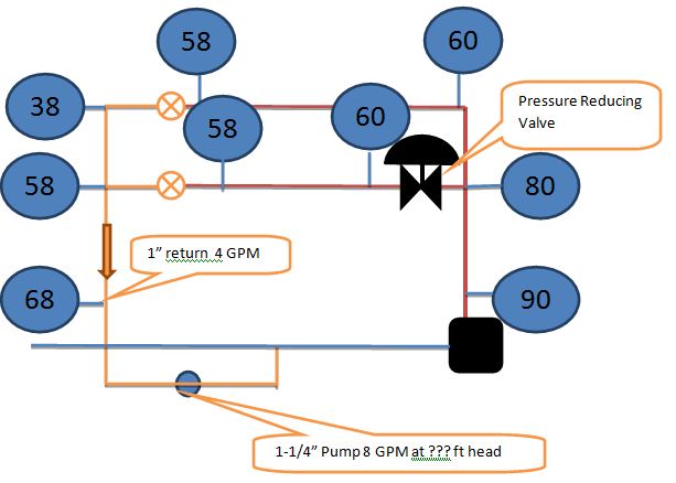 The last three articles outlined pump selection in domestic water recirculation systems. In general, these systems have low flow and low head pumps. What happens in a high rise with pressure reducing valves (PRV) in the hot water supply? The pressure reducing valve introduces a fixed pressure drop which must be added to the calculations.